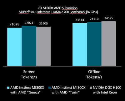 In the latest MLPerf Inference v4.1 benchmarks, AMD's Instinct MI300X GPU demonstrated impressive performance, coming within 2-3% of NVIDIA's DGX H100 systems when paired with AMD's 4th Gen EPYC CPUs. This close competition underscores the MI300X’s potential to deliver powerful AI performance, especially for businesses that are looking for flexibility in hardware choices and high memory capacity.