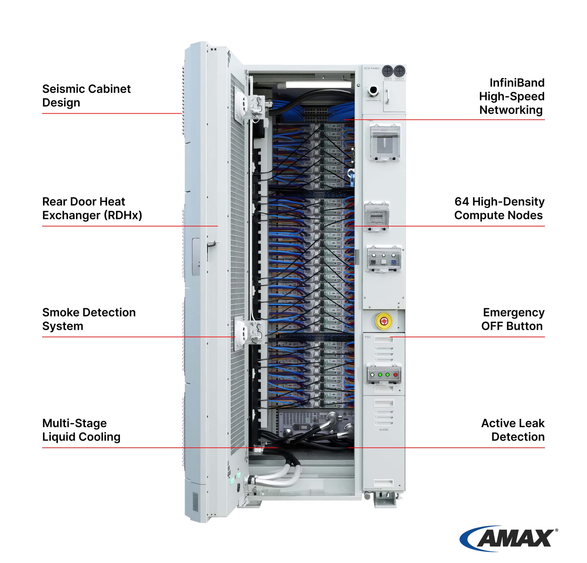 - Cold Plate Liquid Cooling: This direct contact method effectively draws heat away from the chips, significantly reducing the risk of overheating even under substantial computational loads. The cooling mechanism extends to the node level, maintaining a uniformly low temperature across all computing units.