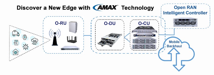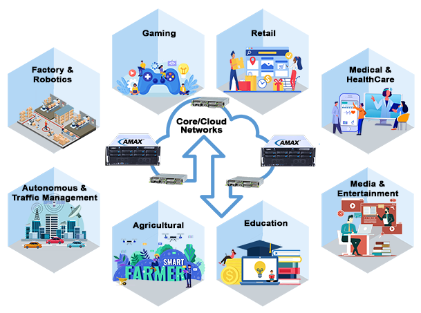 AMAX’s 5G/B5G platforms draw inspiration from Open-RAN (O-RAN), IEEE, ETSI, 6G-IA, 5FPPP, and Next G Alliance. These platforms efficiently integrate a wide range of advanced technologies with highly efficient compute power and storage to support the current demand of upcoming 5G services. The O-RAN platforms process independently at the Remote, the Distributed and Central Units (RUs, DUs, CUs) placed in multiple locations supporting the functional splits. Our Multi-access Edge Computing (MEC) gateways and High-Performance Computing (HPC) servers play an important role to further guarantee the capability of the O-RAN solution to support the stringent requirements associated with end-to-end latency and transport network capacity.
