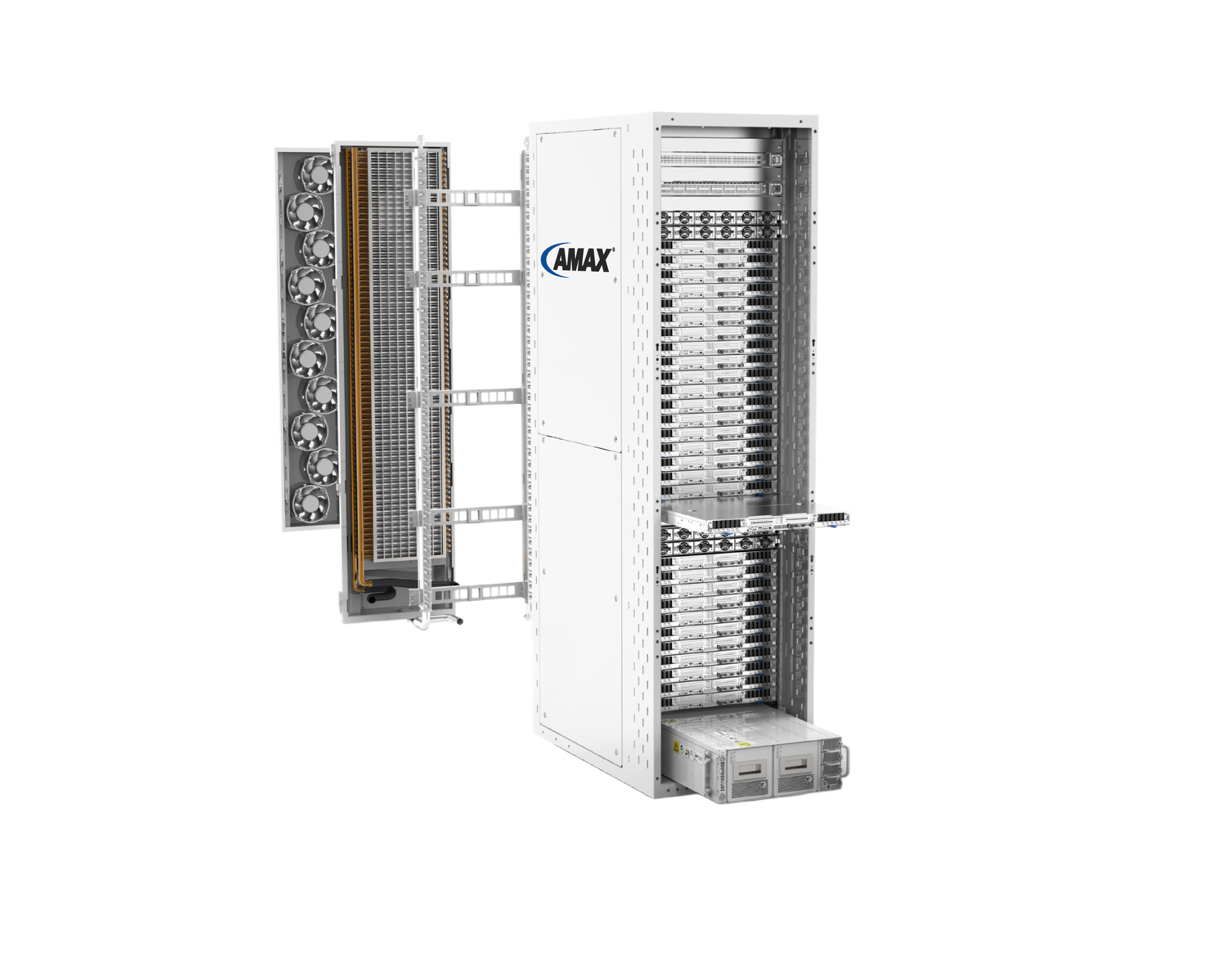 The AMAX IntelliRack AL100, featuring hybrid cooling technology and a rear door heat exchanger, exhausts all heat to facility water, delivering 100kW capacity for the most intensive AI applications. Offering a cooling potential of up to 100kW, the IntelliRack series provides reliable, scalable infrastructure solutions that emphasize energy efficiency and reduce environmental footprint. Chosen by tier one cloud service providers to power the most sophisticated data centers globally, the IntelliRack series sets a new standard for enterprise AI deployment.