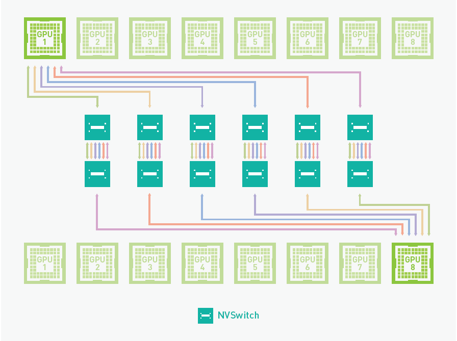Each port on the NVSwitch supports a 25 GB/s transfer rate in both directions. The crossbar design is non-blocking, ensuring that all ports can simultaneously communicate at full NVLink bandwidth. As shown in Figure-1, each of the 8 GPUs on a baseboard connects to all 6 NVSwitches via a single NVLink. Eight ports on each NVSwitch are dedicated to facilitating communication with GPUs on the other baseboard. This configuration allows any GPU on a baseboard to communicate with others on the same board at a full bandwidth of 300 GB/s using just one NVSwitch traversal.