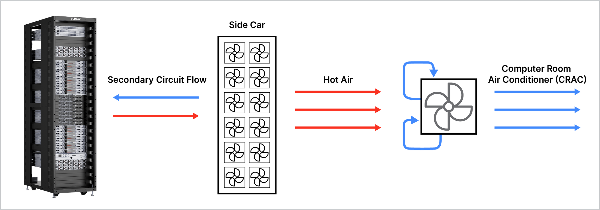 The system circulates liquid coolant to absorb heat from high performance components within the rack. This heat is then transferred to the air via a sidecar cooling unit, which expels the hot air into the Computer Room Air Conditioner (CRAC) for final dissipation. This efficient design provides a cost-effective and scalable cooling solution for modern data centers.